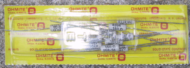 page updated 05/13/2014 contact us [+] home [+] wire wound resistors [+] carbon composition resistors [+] rheostats [+] potentiometers [+] trim pots [+] attenuators, pads, etc [+] resistors - wire wound .004 ohm 5% Dale SPK-701 $5.00 .05 ohm 105 watt 5% X-27034 $7.00 .07 ohm 100 watt adjustable ribflex resistor 411-4166 5402843 $3.00 [+] .1 ohm 3 watt $2.00 .1 ohm 5 watt $2.00 .1 ohm 100 watt Clarostat VK100NEW $7.00 .1 ohm 100 watt Ward Leonard ribflex $4.00 .11 ohm 5 watt 5% RCL $2.00 .125 ohm 75 watt Truohm $4.00 [+] .125 ohm 3500 watt - yes 3.5 KW - $250.00 .14 ohm 10 watt 5% Dale RS-5 $3.00 .15 ohm 100 watt 3% Dale RH-100 gold clad $10.00 .2 ohm 25 watt 3% Dale RH-25 gold clad $6.00 .2 ohm 10 watt 1% Tepro $4.00 .25 ohm 5 watt 5% Dale $1.50 .3 ohm 10 watt 5% RCL $2.00 .332 ohm 5 watt RCL $2.00 .375 ohm 30 watt Shallcross - gold anodized $4.00 [+] .47 ohm 5 watt 1% Lect $4.00 1 ohm 3 watt Shallcross $1.50 1 ohm 3 watt Sprague Blue Jacket $2.00 1 ohm 5 watt Dale CW5 $2.00 1 ohm 10 watt Ohmite $3.00 [+] 1 ohm 25 watt5% Dale HL-25-17N $4.00 1 ohm 100 watt $10.00 1 ohm 20 watt Ohmite Brown Devil No. 1802A $2.00 [+] 1 ohm 600 watt Ohmite 15 inch by 2.5 inch dia $40.00 1.1 ohm 3 watt Sprague Blue Jacket $2.00 1.5 ohm 225 watt IRC type 101/2 $20.00 2 ohm 3 watt Lect $2.00 [+] 2 ohm 5 watt cement $1.00 2 ohm 10 watt irc rw29g2r0 $2.00 2 ohm 30 watt Ward Leonard RW34G2R0 $3.00 [+] 2 ohm 90 watt 5% Dale $6.00 2 ohm 100 watt IRC type 6 1/2 E $8.00 2.2 ohm 7 watt IRC cement $2.00 [+] 2.5 ohm plaque resistor Ward Leonard 8511 7D $2.00 3 ohm, 10 watt Dale $2.00 [+] 3 ohm 40 watt Ward Leonard flatohm 40S3WL $4.00 [+] 3 ohm 90 watt 5% Dale $6.00 3 ohm 250 watt 3% Dale RH $15.00 4 ohm 225 watt Ohmite - good amplifier dummy loads $18.00 [+] 5 ohm 3 watt Claro wire wound $1.00 [+] 5 ohm 3 1/4 watt Ohmite $1.00 5 ohm 5 watt Clarostat $2.00 5 ohm 11 watt Ohmite $1.00 5 ohm 25 watt Ohmite $3.00 5 ohm 25 watt Dale RH25, heatsinkable $4.00 5 ohm 30 watt 5% Lectrohm flat $4.00 5 ohm 75 watt $5.00 5 Ohm 200 watt Ward Leonard rib-flex, adjustable $10.00 [+] 5 Ohm 400 watt tapped at 3.5 ohms $19.00 [+] 5.11 Ohm 25 watt Western Electric KS812L17A WE 5R11 man by Memcor or Ohmite $3.00 [+] 5.62 ohm 3 watt 10% $1.00 6 ohm 3 watt $1.00 6 ohm 50 watt adjustable TRW $3.00 [+] 6 ohm 100 watt Hardwick, Hindle $5.00 6 ohm 275 watt Memcor $9.75 [+] 6.2 ohm 75 watt ribflex $5.00 6.8 ohm 110 watt 10% P9 GBS 30/1333 6R8 WM110 $9.00 [+] 7 ohm 100 watt $7.00 7.1 ohm 100 watt Western Electric KS14175 L5A $8.00 7.5 ohm 25 watt Clarostat $1.50 [+] 7.5 ohm 250 watt Dale - gold anodized $--.-- [+] 8 ohm 25 watt Omi 1% tolerance - gold anodized $5.00 [+] 8 Ohm 55 watt Res Inc RW35V8R0 $8.00 [+] 8.2 Ohm 225 watt True-Ohm $--.-- [+] 9 ohm 3 watt $2.00 9 ohm 95 watt 5% Dale HL-95-08Z flat $8.00 9.1 ohm 70 watt 5% Dale HL-70-08Z flat $7.00 [+] 10 ohm 25 watt Dale $2.00 [+] 10 ohm 25 watt Ohmite D25K10R No 0363 $6.00 10 Ohm 40 watt Ward Leonard 40S10WL Flatohm $5.00 [+] 10 ohm 50 watt Ohmite $4.00 10 ohm 50 watt 0.5% DWS 25 WM 43 $15.00 10 ohm 75 watt $5.00 10 ohm 100 watt WH100V100J $8.00 10 ohm 100 watt Clarostat RE-1076, non inductive, ferrule ends $10.00 10 ohm 100 watt Ward Leonard ribflex $8.00 10 ohm 200 watt Ward Leonard ribflex $11.00 12 ohm 5 watt IRC $1.25 [+] 13 ohm 6 watt 1% RCL $2.00 14.3 ohm 100 watt 1% Dale gold clad (rfe) $8.00 15 ohm 5 watt 1% RCL $2.00 15 ohm 20 watt adjustable IRC type DHA (dog bone) $2.00 15 ohm 20 watt Clarostat $3.00 15 ohm 25 watt Ward Leonard $2.00 [+] 15 Ohm 40 watt Ward Leonard Flatohm 40S15WL $4.00 [+] 15 ohm 50 watt adjustable Ward Leonard $5.00 15 ohm 50 watt low inductance, fast-on terminals $8.00 16 ohm 3 watt 1% Dale RS2B-92 $1.00 18 ohm 25 watt Sprague Koolohm $3.00 20 ohm 10 watt Lectrohm $1.00 [+] 20 ohm 200 watt ribflex $12.00 20 ohm 160 watt Western Electric part #KS8512L42C $10.00 20.5 ohm 5 watt 3% Dale RS-5 $0.95 22.5 ohm 250 watt 1% Dale RH250 $16.00 23.7 ohm 20 watt 1% Dale RH-25 $8.00 24 ohm 75 watt adjustable $5.00 24 ohm 100 watt adjustable $6.00 24 ohm 113 watt $2.50 25 ohm 25 watt Ohmite No 0200C $5.00 25 ohm 50 watt Ohmite adjustable $3.25 25 ohm 160 watt $9.00 25 ohm 175 watt adjustable Ohmite dividohm No 1158 210-175P-46 $12.00 26.7 ohm 100 watt 1% Dale gold clad (rfe) $10.00 30 ohm 3 watt Sprague Blue Jacket $2.00 30 ohm 40 watt Ward Leonard flatohm 44S30WL $4.00 33 ohm 3 watt Dale RS6 $2.00 33 ohm 5 watt Truohm $0.80 [+] 35 ohm 75 watt adjustable Ohmite $5.00 36.5 ohm 120 watt Dale - gold anodized $10.00 [+] 40 ohm 75 watt Ohmite KS8512L39A-WE 40R2 made for Western Electric $5.00 50 ohm 3 watt RCL $1.00 [+] 50 ohm 20 watt $2.00 [+] 50 ohm 50 watt non-inductive $6.00 [+] 50 ohm 25 watt Ohmite No 0200D $5.00 50 ohm 75 watt $5.00 50 ohm 100 watt Ohmite No 2204 $8.00 50 ohm 175 watt Ohmite $15.00 51 ohm 5 watt TRW AS-5 $2.00 75 ohm 5 watt 5% $2.00 75 ohm 50 watt 3% tolerance Ommi HT-50 gold ano $6.00 [+] 75 ohm 100 watt $6.00 [+] 82 ohm 75 watt ZWS 30/133 - made in Germany $21.00 90 ohm 10 watt $0.75 [+] 100 ohm 3 watt IRC cement $0.75 [+] 100 ohm 5 watt Dale RS-5 1% tolerance $2.00 [+] 100 ohm 10 watt 5% $2.00 100 ohm 10 watt Dale RS10 $3.00 100 ohm 10 watt TRW $3.00 [+] 100 ohm 25 watt Ohmite Divideohm, No 0368 $5.00 100 ohm 50 watt Dale gold anodized $3.00 [+] 100 ohm 100 watt RWH100V100J 100W SEF $7.00 100 ohm 100 watt RWH100V100J 100W SEF with mounting bracket $8.00 [+] 110 ohm 75 watt adjustable, Seci (Milano) ROR75 110R XE $19.00 120 ohm 7 watt Sprague bluejacket $4.00 [+] 150 ohm 3 watt Ohmite $1.50 [+] 150 ohm 5 watt 10% Dale CP-5 $1.00 [+] 150 ohm 12 watt non-inductive Ohmite 2060 $7.00 150 Ohm 15 watt IRC - "dog bone", old style $2.00 [+] 150 ohm 75 watt adjustable 5% tolerance $10.00 160 ohm 25 watt Memcor KS8512 L17A made for Western Electric $4.00 180 ohm 75 watt adjustable 5% tolerance $10.00 200 ohm 10 watt 1 % TRW $4.00 [+] 200 ohm 11 watt Ohmite $2.00 200 Ohm 160 watt Western Electric KS8512L42C WE $5.00 [+] 240 ohm 5 watt 5% Tepro $1.00 249 Ohm,35 watt W